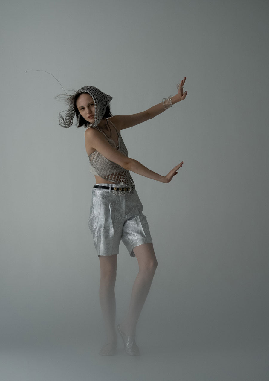 シワ加工が施されたシルバーのホイル感が魅力のハーフパンツ。