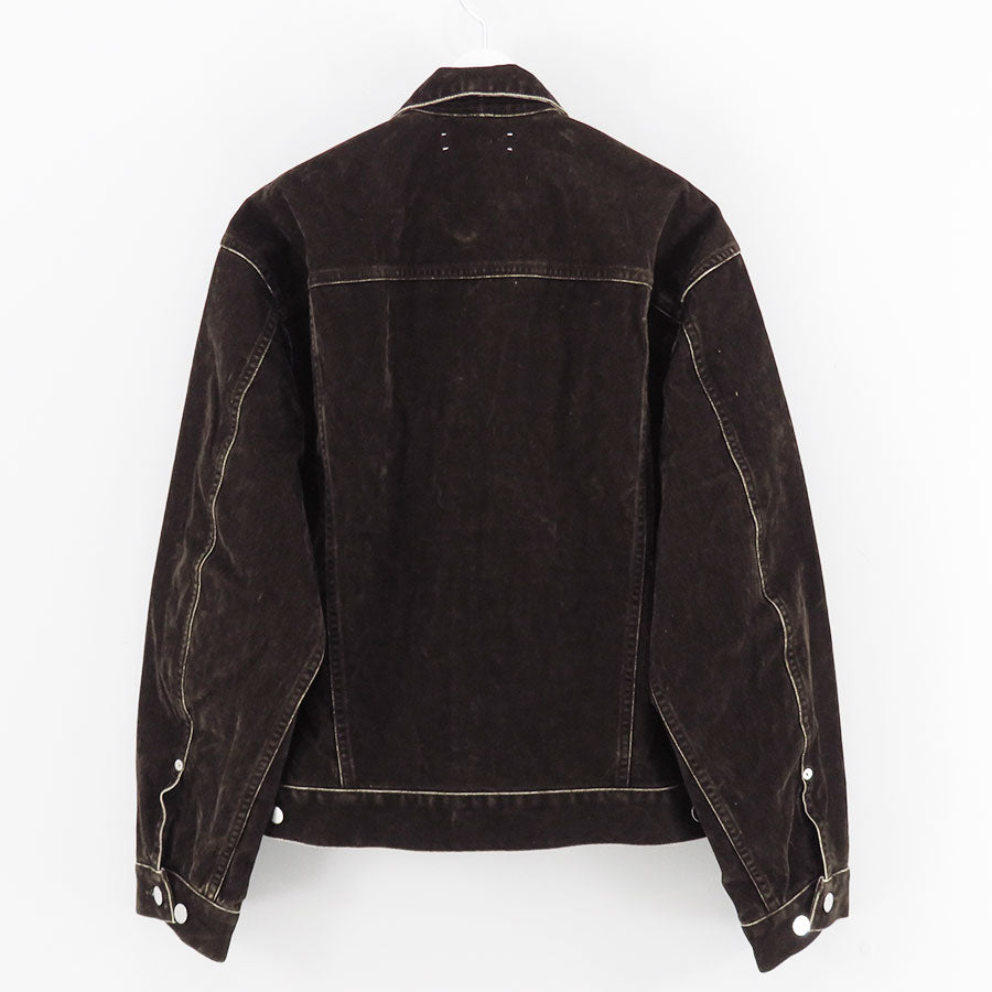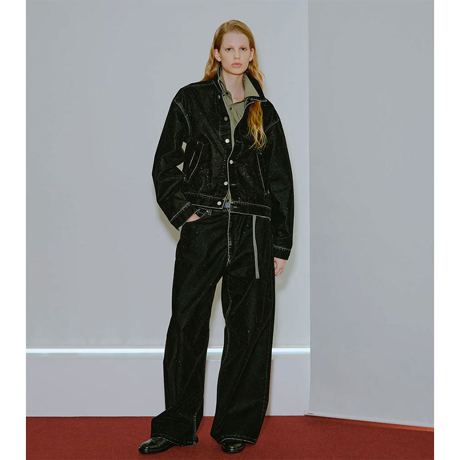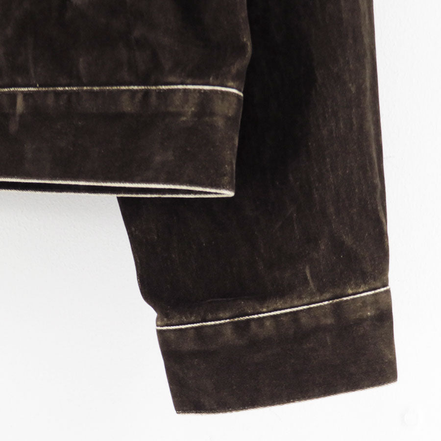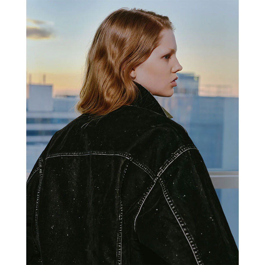 REVERBERATEが提案するフロッキージャケット。カジュアルな印象よりも少しドレス味の加わった綺麗なシルエットとなっており、一見直線的に見える様なところでも繊細なカーブを使用している。型紙上はゆとりを多く取り、着用時にはコンパクトに見える様に設定している。全面フロッキープリント生地。洗いによって当たりを出している。