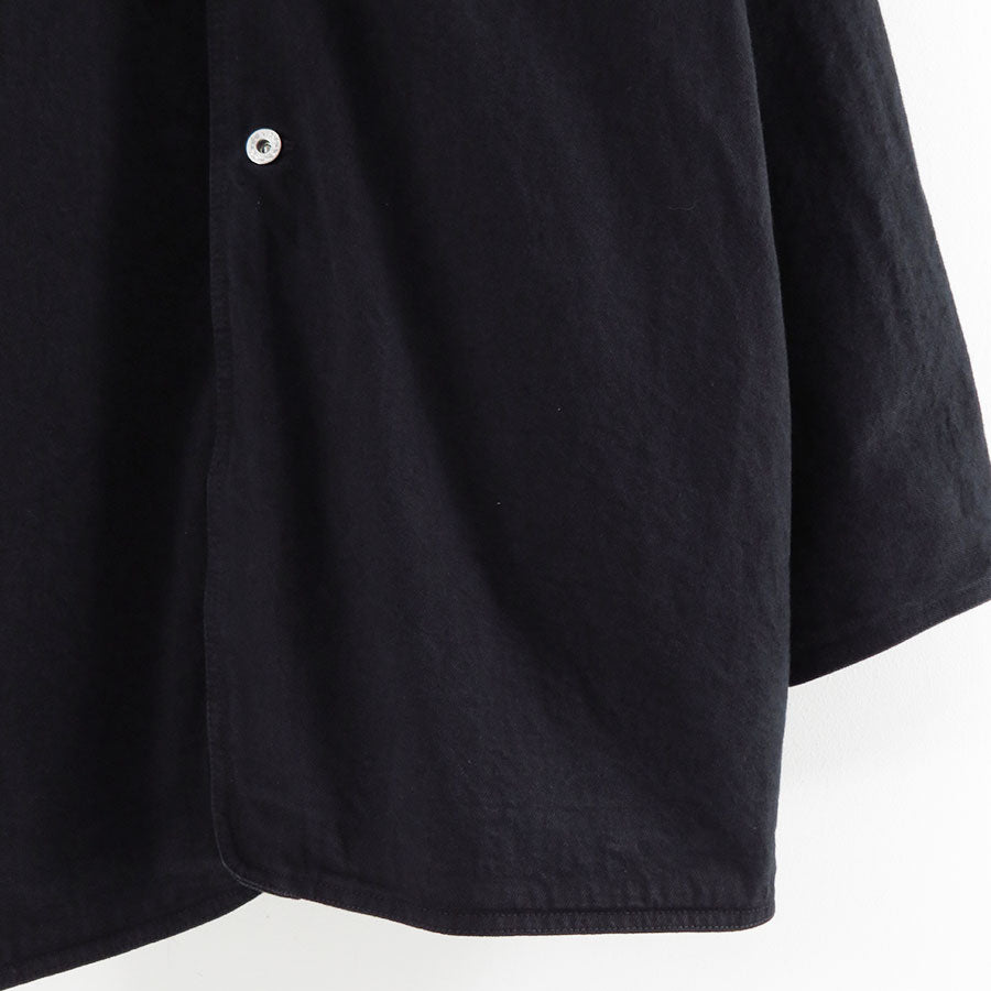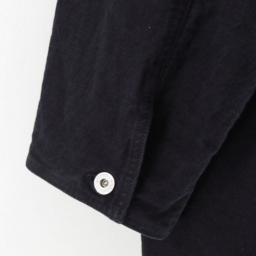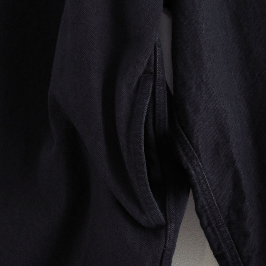 1960年代のデニム素材を研究し、リプロダクトした14ozデニム⽣地を使⽤したチョアコート。オーバーダイを施し、エイジングにより⿊⾊が落ちてインディゴカラーが覗くよう設計しています。デザインはアメリカ由来のチョアブルゾンとフランスメゾンの乗馬コートを掛け合わせたもので、実用性とエレガンスを併せ持つシルエットに再構築。部分的にフランス産のオイルドレザーを使用し、さりげない上質さを加えています。